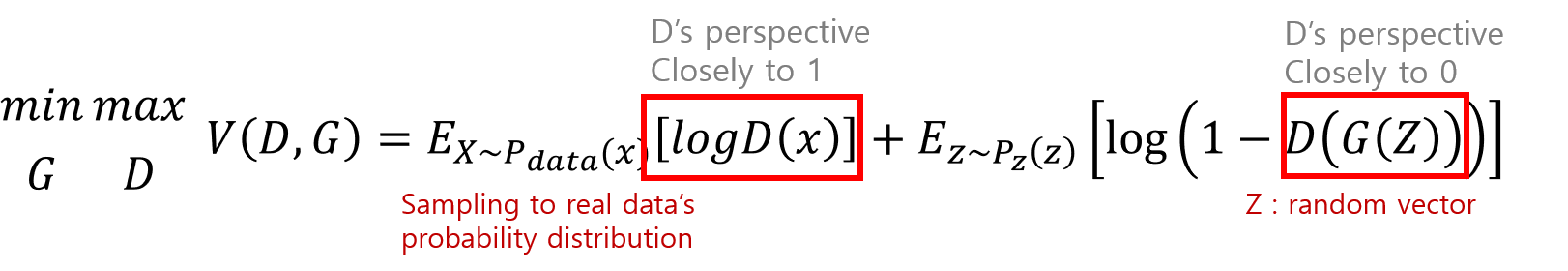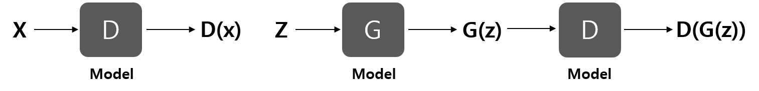 Discriminator는 x 데이터에 대해 사전에 학습되고, Generator가 random vector를 이용해 진짜 같은 가짜 개체를 생성하면 학습된 Discriminator는 다시 이것을 가짜로 판별하도록 추가 학습하게 됩니다.