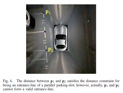 하지만 거리 제약을 만족시켰다고 해서 타당한 entrance-line을 형성한다고 볼 수 없다. 위 그림이 그 예시 중 하나다. 또한, 해당 직선이 타당한 entrance-line이라고 가정하면 연관된 주차 구역이 시계 방향 쪽에 있는지 반 시계 방향 쪽에 있는지와 직각인지 기울어진 건지를 결정해야 한다.