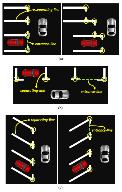 - 운전자에 의해 제공된 주차 구역 entrance-line에 관한 두 지점에 기반하여 다양한 유형의 parking-slot-markings를 인식할 수 있는 투터치 방법.
