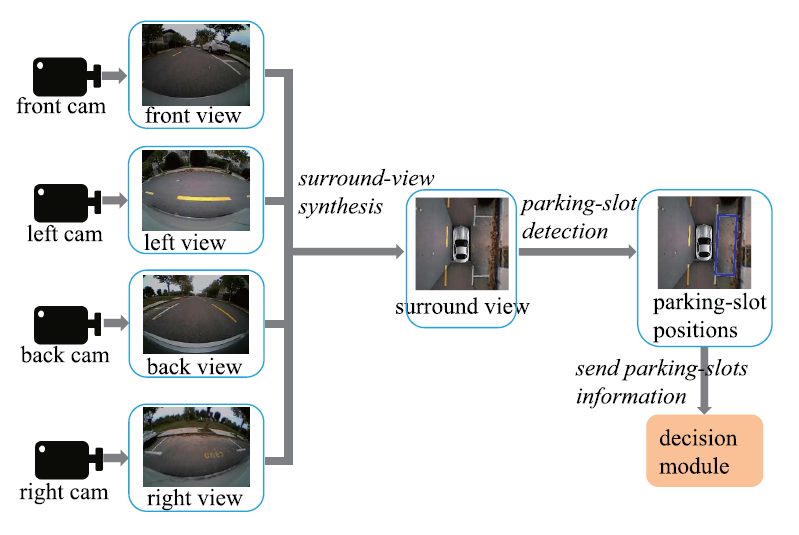 위 그림은 전형적인 vision-based 주차 구역 탐지 시스템의 고수준 구조를 보여준다. 보통 surround-view synthesis와 parking-slot detection from the surround-view 두 독립적인 모듈로 이루어진다. 일반적으로 surround-view 카메라 시스템은 차량 주변에 탑재된 각기 다른 방향을 찍는 4~6개의 wide-angle 카메라들로 구성된다. Surround-view synthesis 모듈은 차량 주변의 360도 surround-view 이미지를 생성한다. 주차 구역 탐지 모듈은 이 surround-view 이미지를 입력으로 해서 주차 구역을 탐지하고 그것들의 차량 중심(vehicle-centered) 좌표계에 관한 물리적인 위치를 내보낸다.