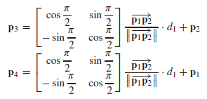 p1, p2에 의해 정의된 local image pattern이 "right-angled clockwise" 또는 "right-angled anticlockwise"로 분류되었다고 하면, 보이지 않는 두 개의 좌표 p3, p4는 쉽게 계산될 수 있다. 위 그림의 (a)가 그 예시로, 아래의 계산으로 추론할 수 있다.