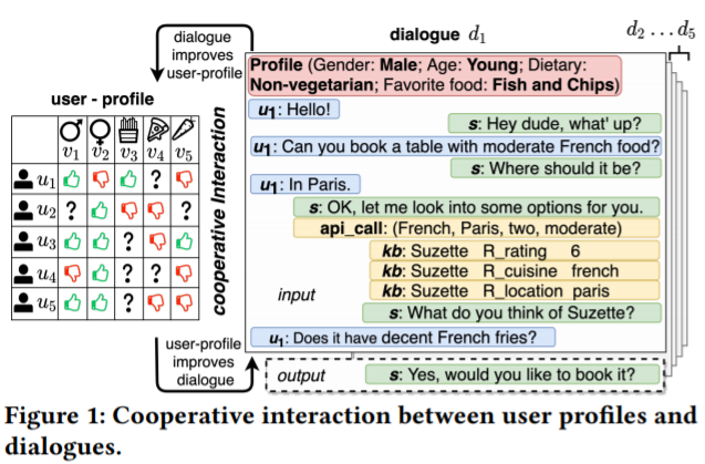 오른쪽 대화에서 user profile은 {(Gender, Male), (Age, Young), (Dietary, Non-vegetarian), (Favorite food, Fish and Chips)}로 표기된다. 은 dialogue history 이고 historical utterances 로부터 집약된 a sequence of words로 표시된다. 마지막으로, 는 현재 user utterance이면서 user의 현재 request로 표현된다.