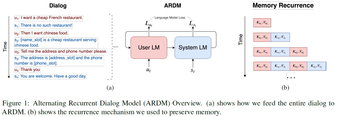 ARDM은 memory recurrence를 통해 user와 system utterance 분포를 교대로 학습하는 별도의 두 pre-trained LM으로 구성된다.