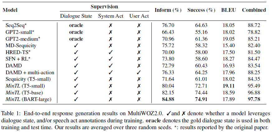 대화 시스템 학습을 위해 데이터를 수집하고 annotation하는 건 시간이 많이 들고 도메인 간 호환도 잘 안 된다. 그래서 human supervision을 줄이기 위해 pre-trained language model을 이용한다. 이전의 TDS는 보통 특정 task에 특화된 여러 모듈로 이루어져있고 그러한 모듈은 pre-training stage를 거의 거치지 않는다. 이렇다보니 pre-trained LM을 다른 대화 tasks에 적응시키기 위해 tasks-specific 아키텍쳐 수정이 필요하다. MinTL (Minimalist Transfer Learning)은 TDS의 시스템 설계 과정을 단순화하고 annotated data에 대한 의존도를 낮춘다.