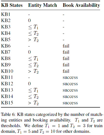 Updated 는 외부 knowledge (KB)와 booking APIs를 query하는데 사용된다. 먼저, entities의 매칭 수와 예약 가능 수에 따라 query 결과 를 위와 같이 분류한다. 여기서 과 는 매칭된 엔티티 수의 threshold다. 결과에 따라, 학습가능한 KB state embeddings 집합 중 하나의 embedding 을 룩업한다. 여기서 는 가능한 KB states의 수다. KB state embeddings은 pre-trained models의 token embeddings을 확장함으로써 쉽게 얻어질 수 있다. 그 다음, 룩업된 embedding 는 delexicalized 응답 을 생성하기 위해 response decoder의 start token embedding으로써 사용된다.
