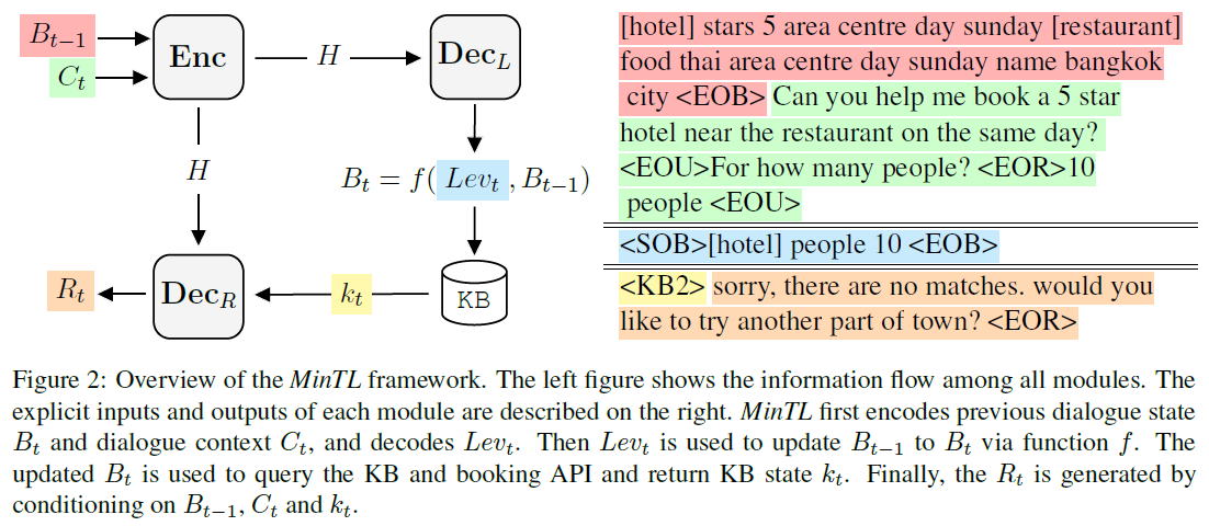 MinTL은 간단하지만 효과적인 transfer learning framework다. 이 framework는 pre-trained Seq2Seq 모델에 plug-and-play를 가능하게 하고 DST와 NLU를 동시에 학습할 수 있다. 또한, copy mechanism을 사용하는 이전의 방법들과 달리 old states와 new states 간 차를 모델링하는 Levenshtein belief spans ()를 도입한다. 먼저, MinTL은 이전 dialogue state를 업데이트하기 위해 를 decoding한다. 그런 다음, 업데이트된 state는 외부 knowledge base를 검색하는데 사용된다. 마지막으로, response decoder는 dialogue context와 knowledge base match 결과를 조건화하여 response를 decoding한다.